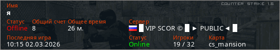 Играет на Counter Strike 1.6 сервере. Страна: РоссияПервый раз замечен 14:25 21.02.2026