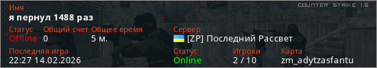 Играет на Counter Strike 1.6 сервере. Страна: УкраинаПервый раз замечен 22:21 14.02.2026