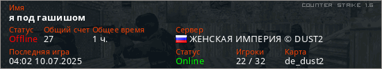Играет на Counter Strike 1.6 сервере. Страна: РоссияПервый раз замечен 06:40 30.05.2025