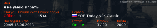 Играет на Counter Strike Source сервере. Страна: РоссияПервый раз замечен 17:55 06.03.2023
