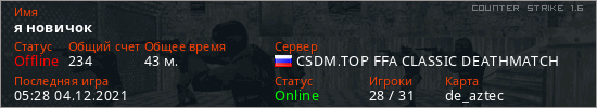 Играет на Counter Strike 1.6 сервере. Страна: РоссияПервый раз замечен 04:48 04.12.2021