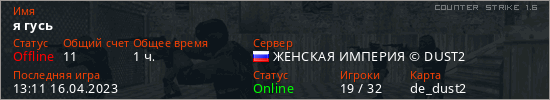 Играет на Counter Strike 1.6 сервере. Страна: РоссияПервый раз замечен 16:52 23.03.2023