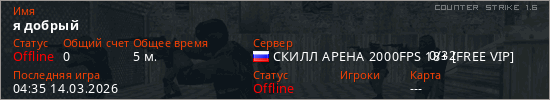 Играет на Counter Strike 1.6 сервере. Страна: РоссияПервый раз замечен 04:26 14.03.2026
