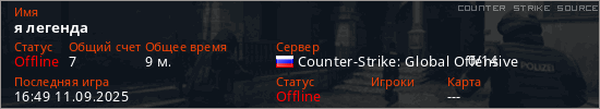 Играет на Counter Strike Source сервере. Страна: РоссияПервый раз замечен 14:35 09.09.2025