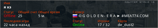 Играет на Counter Strike 1.6 сервере. Страна: РоссияПервый раз замечен 03:21 16.03.2026