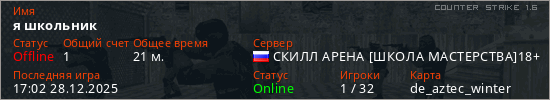 Играет на Counter Strike 1.6 сервере. Страна: РоссияПервый раз замечен 22:39 26.12.2025
