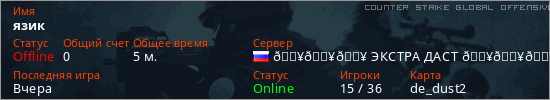 Играет на Counter Strike Global Offensive сервере. Страна: РоссияПервый раз замечен 21:09 19.04.2026