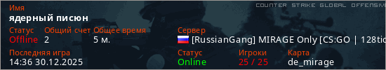 Играет на Counter Strike Global Offensive сервере. Страна: РоссияПервый раз замечен 14:15 30.12.2025