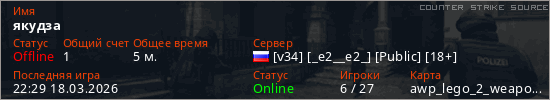 Играет на Counter Strike Source сервере. Страна: РоссияПервый раз замечен 22:14 18.03.2026