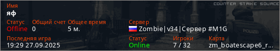 Играет на Counter Strike Source сервере. Страна: РоссияПервый раз замечен 19:21 27.09.2025