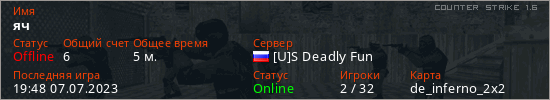 Играет на Counter Strike 1.6 сервере. Страна: РоссияПервый раз замечен 19:25 07.07.2023