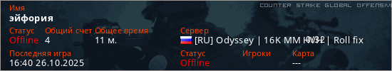 Играет на Counter Strike Global Offensive сервере. Страна: РоссияПервый раз замечен 16:22 26.10.2025