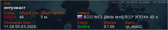 Играет на Counter Strike Global Offensive сервере. Страна: РоссияПервый раз замечен 11:24 05.03.2026