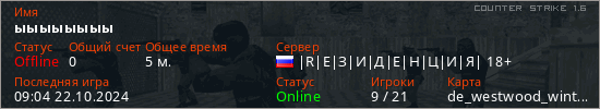 Играет на Counter Strike 1.6 сервере. Страна: РоссияПервый раз замечен 09:02 22.10.2024