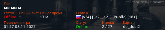 Играет на Counter Strike Source сервере. Страна: РоссияПервый раз замечен 18:41 05.08.2024