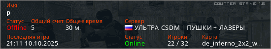 Последний раз был в сети 21:11 10.10.2025 Игрок с таким ником замечен на 30 серверах
