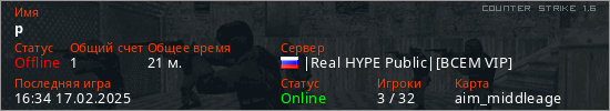 Играет на Counter Strike 1.6 сервере. Страна: РоссияПервый раз замечен 20:40 10.09.2024