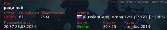 Играет на Counter Strike Global Offensive сервере. Страна: РоссияПервый раз замечен 21:12 23.08.2024