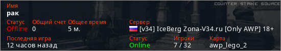 Играет на Counter Strike Source сервере. Страна: РоссияПервый раз замечен 05:43 22.01.2026