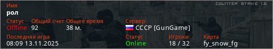 Играет на Counter Strike 1.6 сервере. Страна: РоссияПервый раз замечен 05:45 31.10.2025