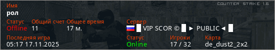 Играет на Counter Strike 1.6 сервере. Страна: РоссияПервый раз замечен 13:13 13.11.2025
