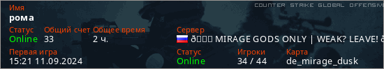 Играет на Counter Strike Global Offensive сервере. Страна: РоссияПервый раз замечен 15:21 11.09.2024