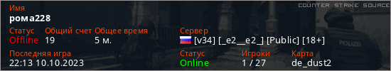 Играет на Counter Strike Source сервере. Страна: РоссияПервый раз замечен 22:09 10.10.2023