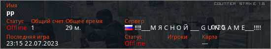 Играет на Counter Strike 1.6 сервере. Страна: РоссияПервый раз замечен 22:39 22.07.2023