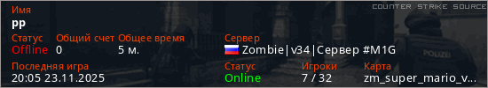 Играет на Counter Strike Source сервере. Страна: РоссияПервый раз замечен 20:03 23.11.2025