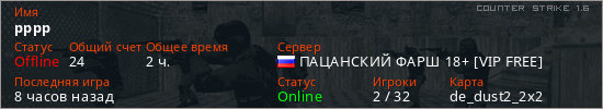 Играет на Counter Strike 1.6 сервере. Страна: РоссияПервый раз замечен 16:15 15.03.2026