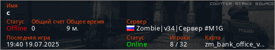 Играет на Counter Strike Source сервере. Страна: РоссияПервый раз замечен 17:15 19.07.2025
