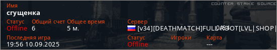 Играет на Counter Strike Source сервере. Страна: РоссияПервый раз замечен 19:27 10.09.2025