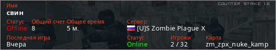 Играет на Counter Strike 1.6 сервере. Страна: РоссияПервый раз замечен 23:06 27.12.2025
