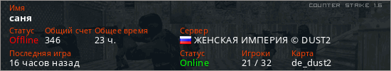 Играет на Counter Strike 1.6 сервере. Страна: РоссияПервый раз замечен 18:11 13.08.2021