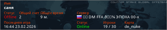 Играет на Counter Strike Global Offensive сервере. Страна: РоссияПервый раз замечен 20:27 22.02.2026
