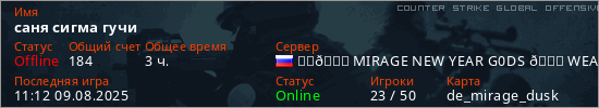 Играет на Counter Strike Global Offensive сервере. Страна: РоссияПервый раз замечен 18:44 25.08.2024