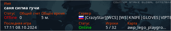 Играет на Counter Strike Global Offensive сервере. Страна: РоссияПервый раз замечен 17:09 08.10.2024