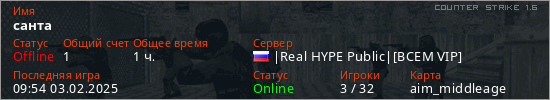 Играет на Counter Strike 1.6 сервере. Страна: РоссияПервый раз замечен 18:57 22.01.2025