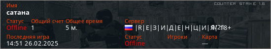 Играет на Counter Strike 1.6 сервере. Страна: РоссияПервый раз замечен 14:49 26.02.2025