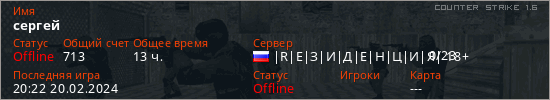 Последний раз был в сети 20:22 20.02.2024 Игрок с таким ником замечен на 32 серверах