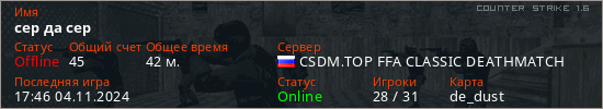 Играет на Counter Strike 1.6 сервере. Страна: РоссияПервый раз замечен 11:30 04.07.2024