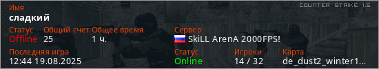 Последний раз был в сети 12:44 19.08.2025 Игрок с таким ником замечен на 17 серверах