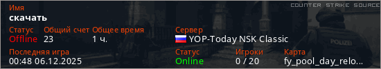 Играет на Counter Strike Source сервере. Страна: РоссияПервый раз замечен 16:52 02.08.2025