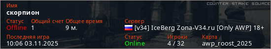 Играет на Counter Strike Source сервере. Страна: РоссияПервый раз замечен 12:56 27.10.2025