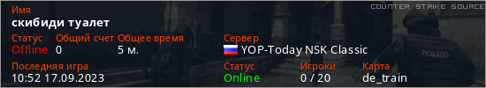 Играет на Counter Strike Source сервере. Страна: РоссияПервый раз замечен 10:32 17.09.2023