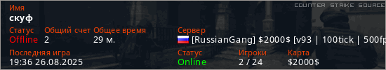 Играет на Counter Strike Source сервере. Страна: РоссияПервый раз замечен 00:29 10.05.2024
