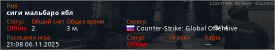 Играет на Counter Strike Source сервере. Страна: РоссияПервый раз замечен 20:55 06.11.2025