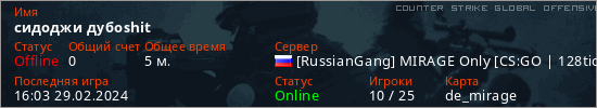 Играет на Counter Strike Global Offensive сервере. Страна: РоссияПервый раз замечен 15:59 29.02.2024