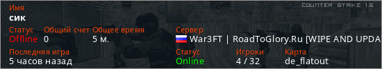 Играет на Counter Strike 1.6 сервере. Страна: РоссияПервый раз замечен 22:14 20.01.2026