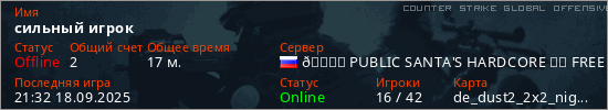 Играет на Counter Strike Global Offensive сервере. Страна: РоссияПервый раз замечен 23:07 01.09.2025